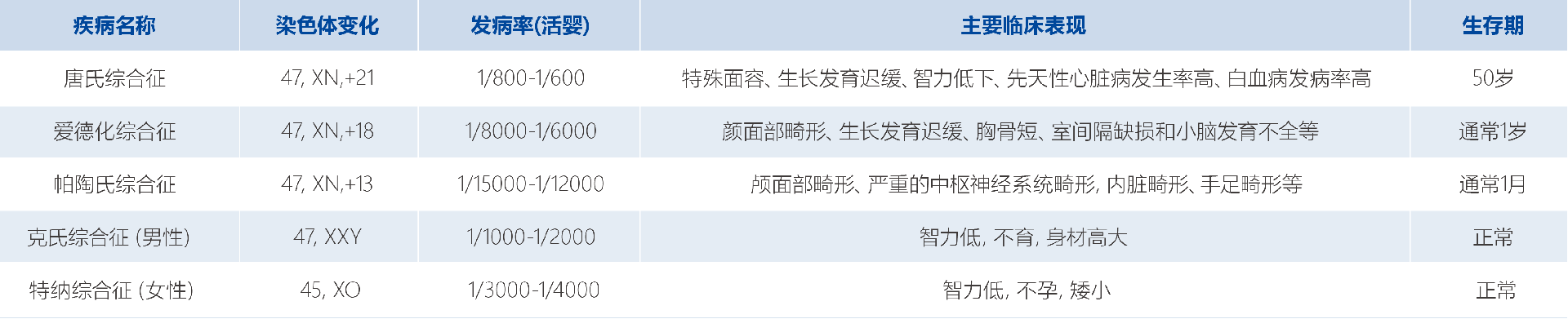 - 其中21号染色体、18号染色体、13号染色体、X染色体是活婴中最常见的出现非整倍体改变的染色体,相应的遗传疾病为唐氏综合征(21三体)、爱德华综合征(18三体)、帕陶综合征(13三体)、克氏综合征(XXY)、特纳综合征(XO)等。